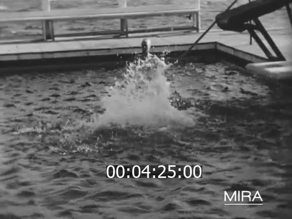 SUN BEACH - 8/1951 - Leïla au toboggan puis plongeant du 2ème plongeoir et plongeoir élastique. B et Myrtil nagent... Myrtil gros plan - après son plongeon (avec ses nattes) - Ralenti - Déjeuner avec les Lefèvre au Mont-Boron - Vues - Annie Bizalion, Monique Guyot, B, Leïla et Myrtil et le maître-nageur. Une des filles de l'opérateur descend un toboggan jusque dans une piscine [l'opérateur indique piscine Sun Beach]. À nouveau quelques plongeons depuis le plongeoir, des deux soeurs. La fille aînée fait un plongeon plus étudié depuis le plongeoir, prend bien la pose avant de plonger dans l'eau. L'épouse de l'opérateur nage dans la piscine. La plus jeune grimpe le bord et pose. Elle plonge rapidement depuis le plongeoir puis nage dans la piscine. La plus grande se concentre pour faire un plongeon. Elle rejoint le bord de la piscine en nageant. Elle descend à nouveau le toboggan, plan rapproché d'elle nageant la brasse pour rejoindre le bord. Elle fait un plongeon depuis un plongeoir, puis nage ; plonge et nage. À nouveau sur le toboggan. [00:02:51:18] Excavatrice collectant des graviers dans la rue, quelques ouvriers autour. [00:02:51:17] Véranda d'un restaurant au Mont Boron ; les convives dont l'épouse et les enfants du cinéaste attablés ; on salue l'opérateur. Vue sur la baie dans laquelle navigue des bateaux de plaisance. Baigneurs sur une des plage du Mont Boron. La baie avec bateaux et quelques baigneurs. PANO sur la baie. [03:23:24:01] [Séquence au ralenti] Retour à la piscine. L'épouse du cinéaste descend le toboggan aquatique. L'une des filles nage, met la tête sous l'eau. Plongeon avec beaucoup d'écume d'une enfant portant un bonne, un chien passe au bord de la piscine. Plans successifs de la fille aînée plongeant depuis le plongeoir ; sa mère dans la piscine. Une des fillettes nageant en regardant l'opérateur. La mère nage. La mère et ses filles nagent, toutes portent des bonnets de bain. Elle se repose au bord de la piscine. À nouveau une des filles plongeant depuis le plongeoir, puis l'autre la seconde l'imitant depuis le bord de la piscine. Nouveau plongeon de l'aînée. L'aînée descend du toboggan et arrive dans l'eau, nage pour rejoindre le bord. La seconde l'imite. La mère et les deux filles plongent simultanément depuis le bord de la piscine, nagent vers le bord d'en face. Elles sortent l'une après l'autre, la plus jeune marche de façon exagérée. Plongeon coupé. L'une des filles tend un morceau de fer ? à l'opérateur en nageant. Même scène, elle le tend vers le moniteur qui la guide avec son bâton ; enfants autour. L'homme aide la fillette à sortir. Il corrige la position des filles sur le plongeoir, l'une saute aidée du moniteur. Les filles nagent vers le rebord. Le moniteur fait souffler l'aînée dans une bouée sous le regard de trois femmes dont la mère. La fillette nage avec la bouée. Elle nage en se tenant à un guide tenu par le maître-nageur. Pose des trois femmes en maillot de bain. La fillette dans l'eau suivant le guide du maître nageur.