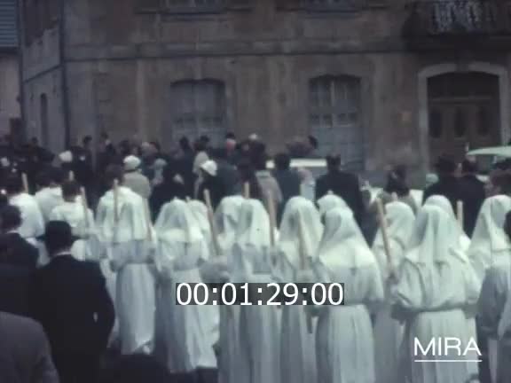 Communion : La famille sort sur le perron de la maison en tenues adéquates (filles en tailleur, enfant communiant en toge avec une croix autour du cou). La famille pose devant la maison. [00:00:18:13] Fanfare militaire dans la rue puis sur la place d'une ville. Rangée de communiants avec des bougies en main. Un chef d'orchestre dirige la fanfare. Plan sur une femme qui porte un enfant dans la foule. PANO sur la foule dans une grande rue. Défilé : fanfare suivie des communiants. Passage du cortège dans les rues adjacentes.