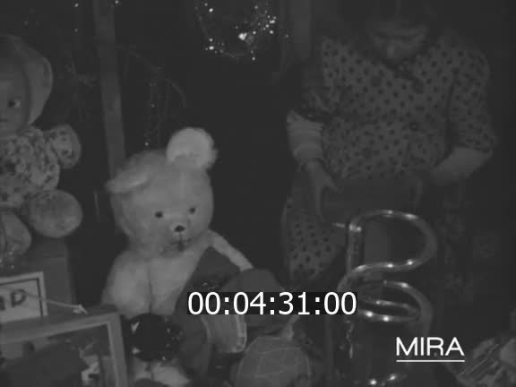 PANO sur une crèche de Noël disposée sur le plateau d'une cheminée. Une main d'enfant pointe du doigt vers la crèche. Les deux filles de l'opérateur devant la crèche. Gros plans sur la crèche (flous), détails. Une montagne de cadeau au pied de l'arbre de Noël : un ours en peluche, un circuit pour petites voitures auquel les filles jouent, des poupées, baby parachute, un sac à main miniature, une peluche de cheval, etc. PANO sur l'arbre de Noël. Une femme actionne le circuit pour voiturettes. Les deux petites filles découvrent leurs cadeaux de Noël. PANO sur le sapin de Noël. Plans sur les petites filles saisissant les jouets au pied du sapin.