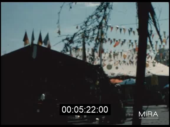 Cartons successifs : "LES FILMS ERTE PRÉSENTENT LA..." / "GRANDE KERMESSE DES FFA" / "BADEN-BADEN 27-28 MAI 1967". Vue rapprochée sur un plan de la kermesse : la disposition des stands, la brasserie... GP sur une photographie de la kermesse sur la place du marché de Baden-Baden. Affiche "GRANDE KERMESSE DES FFA 27-28 MAI 1967" - couronne de fleurs et bannières "BADEN-BADEN" (arbre de mai). Contre-plongées successives sur des banderoles publicitaires remorquées par plusieurs ULM : "WILLKOMMEN KERMESSE F. F. A." / "WOHLT'A'TIGKEITFEST" / "B. BADEN 27. U. 28. MAI". Vue d'ensemble sur les stands dans la rue du marché. GP sur l'arbre de mai dressé devant la mairie et sous des guirlandes. [02:01:14] Carton : "LES STANDS AVANT L'INAUGURATION". Un militaire et un groupe de femmes passent devant le stand boisé du fleuriste. Pâtisserie. Enseignes : "MIREILLE" - "FERDINAND PEITL / GRAVURES ANCIENNES" ( Un lieutenant marche près du stand "MARCHÉ AUX PUCES". Vue rapprochée sur une pagode près du "RESTAURANT VIETNAMIEN". Vue large sur les tables nappées de sa terrasse. Tente du 1er régiment de spahis [reconnaissable à son insigne, une croix de Lorraine sur fond étoilé - ndlr]. Van publicitaire COCA-COLA et soldats déambulant dans le quartier. Pancarte "SCHWARZWALD SPEZIALITÄTEN" (spécialités de Forêt-Noire). Succession de plans larges sur les stands : SPAR, GALERIES LAFAYETTE, "LA BOUTIQUE DE PARIS", "JUVENA KOSMETIK", "LOUIS PHILIPPE", "LINGERIE-CHEMISERIE". Échoppe d'argenterie. Enseignes : "RAAB KARCHER BOUTIQUE", "BAZAR", "TEXTILE LAYETTE". Vues rapprochées sur les stands de la RAAB KARCHER BOUTIQUE, BALLOONS FROM BRITAIN et épicerie-fromagerie. Panneau "HERZLICH WILLKOMMEN" près du chapiteau de la brasserie. Guirlandes de fanions. Pavillons français et allemands. Spécialités alsaciennes sur le menu de la brasserie (bières). Échoppe "FOIE GRAS & ESCARGOTS F. FEYEL". Vue rapprochée sur les bouteilles d'une cave à vin. [INT.] Des employés décorent les tables sous le chapiteau (sponsor KRONENBOURG). Décorations. Une femme en robe bleue, un porte-documents à la main, marche en direction de la terrasse. Une Ford T stationnée près du chapiteau. Panneau "VENEZ DÉGUSTER NOS SPÉCIALITÉS ALSACIENNES". Bâches. Terrasse de la brasserie. Un homme marche entre deux femmes vêtues du costume alsacien près du quartier sportif. Cabanons de tir à l'arc et de pilotage. Train touristique décoré de personnages issus de bandes dessinées populaires : Astérix, Bugs Bunny, Titi, Porky Pig. Une cartomancienne lit les lignes de la main d'un homme près de sa caravane. Plusieurs femmes observent la séance. Écriteaux "PORTE-CLÉS", "TAPE DUR", "ANNEAUX", "ROULETTE". Deux gendarmes sont postés au stand "CODE DE LA ROUTE - BOWLING-TEST DE LA GENDARMERIE". Vue resserrée sur un homme noir derrière un comptoir où sont disposés des verres à shooter. Des hommes déposent de la décoration derrière le comptoir du stand "ROULETTE". Vues rapprochées successives sur la banderole "SAVEZ-VOUS CE QU'EST UN S.S 11 ?" [en référence aux missiles antichars - ndlr]. Des visiteurs observent un hélicoptère exposé. PANO sur l'espace dédié aux spahis. Barbecue (?). Vue large sur un groupe de spahis postés près du stand. [09:52:07] GP sur une carte de visite tenue par une femme : "QUE VOULEZ-VOUS SAVOIR ? MADAME IRMA VOYANTE VOUS DIRA TOUT ! GRAND JEU, TAROTS, LIGNE DE LA MAIN, VENEZ CHEZ LA CARTOMANCIENNE, DIPLÔMÉE S. G. D. G.". Vue large sur la caravane de la cartomancienne et des illustrations. La cartomancienne s'adresse aux visiteurs puis pose avec ses amis dont un guitariste. Vue large sur plusieurs séances de cartomancie puis portraits rapprochés.
