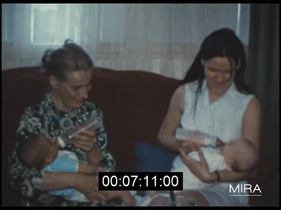 Deux femmes assises côte à côte donnent le biberon à leurs nourrissons. La femme blonde avec son petit garçon sur les genoux, il a un air ébahi, la petite fille blonde passe dans le champ. On fait se regarder les deux bébés qui ont environ le même âge, le petit en bleu pleure un peu, sa mère le calme. Les deux pères posent à présent avec leurs deux nourrissons [n.doc : il s’agit à gauche, en habit militaire, du filmeur], l’homme à gauche fait tenir la petite assise, celui à droite pointe quelque chose hors champ, puis on fait tenir les bébés debout jambes sur les genoux de leurs pères, qui les font sautiller, puis s’embrasser. Les deux femmes assises sur le canapé, la petite fille blonde s’approche de sa mère, qui la recoiffe et lui caresse la tête. L’homme assis de l’autre côté du salon, zoom avant, il se lève et passe dans le champ.