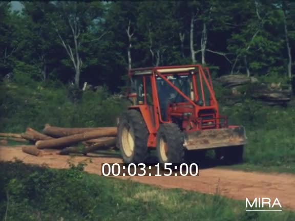 Un homme avec un casque de sécurité, une tronçonneuse et une hache s'avance vers la caméra, en arrière plan: la forêt, des rondins de bois superposés. L'homme avance vers la forêt. Il allume la tronçonneuse. Il scie le bas de l'arbre, il crée une fente, l'arbre tombe, il fait des signes au cinéaste. Plan de la forêt, homme en fond. L'homme découpe les branches de l'arbre tombé. Branches au sol. Rondins de bois empilés, une 2CV orange en arrière plan. Tracteur emmène les rondins, village en fond. Un homme descend du tracteur, remonte et emmène les rondins.