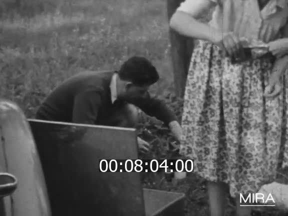 Pique-nique dans la nature, un homme fait sauter une petite fille dans les airs. Une femme la fait tourner dans ses bras puis l'homme de nouveau. Un homme mange une tomate puis montre un pot de sel à l'opérateur. Une dame caresse la joue de la petite fille qui mange un morceau de pain. L'homme qui mange une tomate interagit avec l'opérateur puis se cache de la main. La femme et la petite fille mangent côte à côte. Un homme âgé en costume et chapeau mange du raisin dans une petite coupelle. Panoramique sur les convives. La petite fille dans une voiture portière ouverte. Plan large sur le groupe et la vallée environnante.