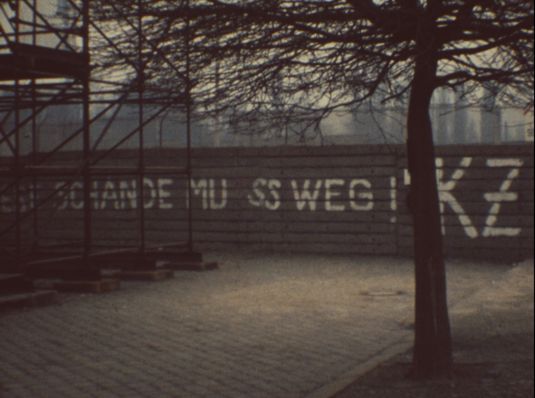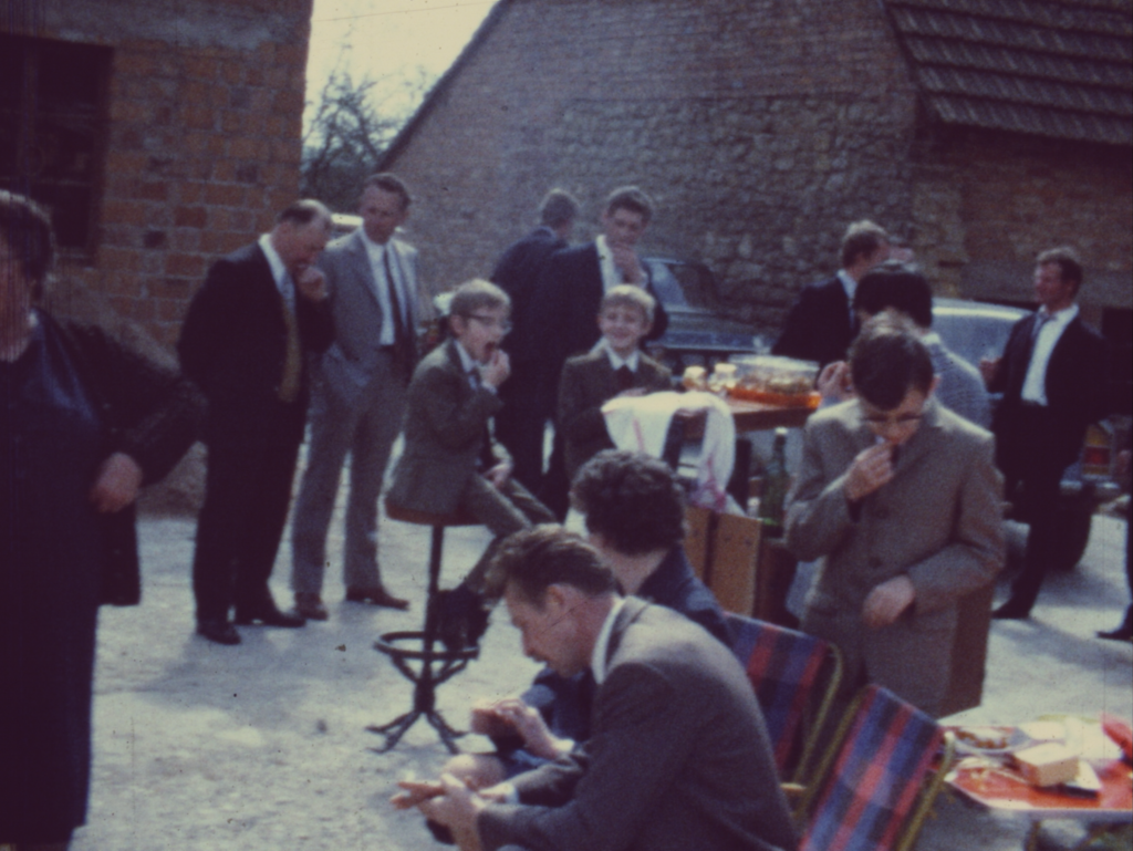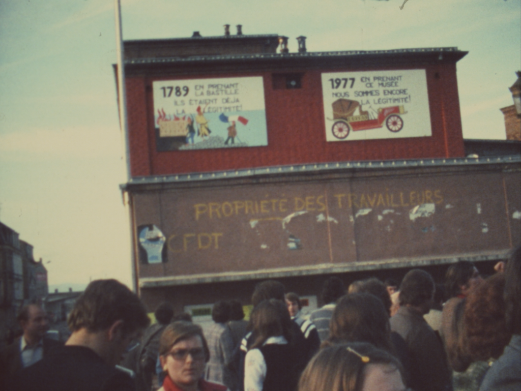 En filmant sa communauté, Gérard Fehr capte des temps collectifs qui comportent parfois une dimension politique plus ou moins explicite. C’est le cas, par exemple, lors de la fête du Travail de 1972, que les hommes du village passent sur le site de l’Association de pêche de Kindwiller, à se détendre, à pêcher, à partager des bières et à jouer aux cartes en compagnie de leurs enfants. Fruit des luttes et des victoires sociales depuis la fin du XIXe siècle, le 1er mai n’est pas un jour férié comme les autres, qui permet notamment à ces travailleurs de passer la journée en famille, mais également de se retrouver collectivement pour en perpétuer la tradition militante. Le rassemblement devant le Musée des travailleurs occupé en 1977, sur le site de la filature HKC à Mulhouse, est une autre séquence marquante de la collection, qui documente une occupation d’usine faisant suite à un mouvement social porté par les ouvriers et ouvrières de la firme Schlumpf et notamment le syndicat de la CFDT, en protestation à des plans massifs de licenciements. Le Musée attire pour les modèles de voitures de luxe exposés, mais il s’agit aussi à travers ces visites de soutenir la lutte, notamment par les dons au moment de la visite du musée, mais aussi en donnant de l’ampleur au mouvement de protestation, comme le montre le grand nombre de personnes réunies devant l’usine.