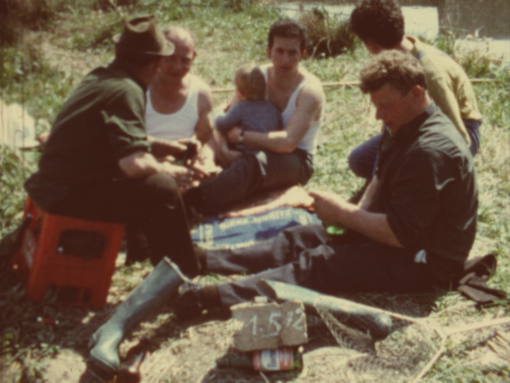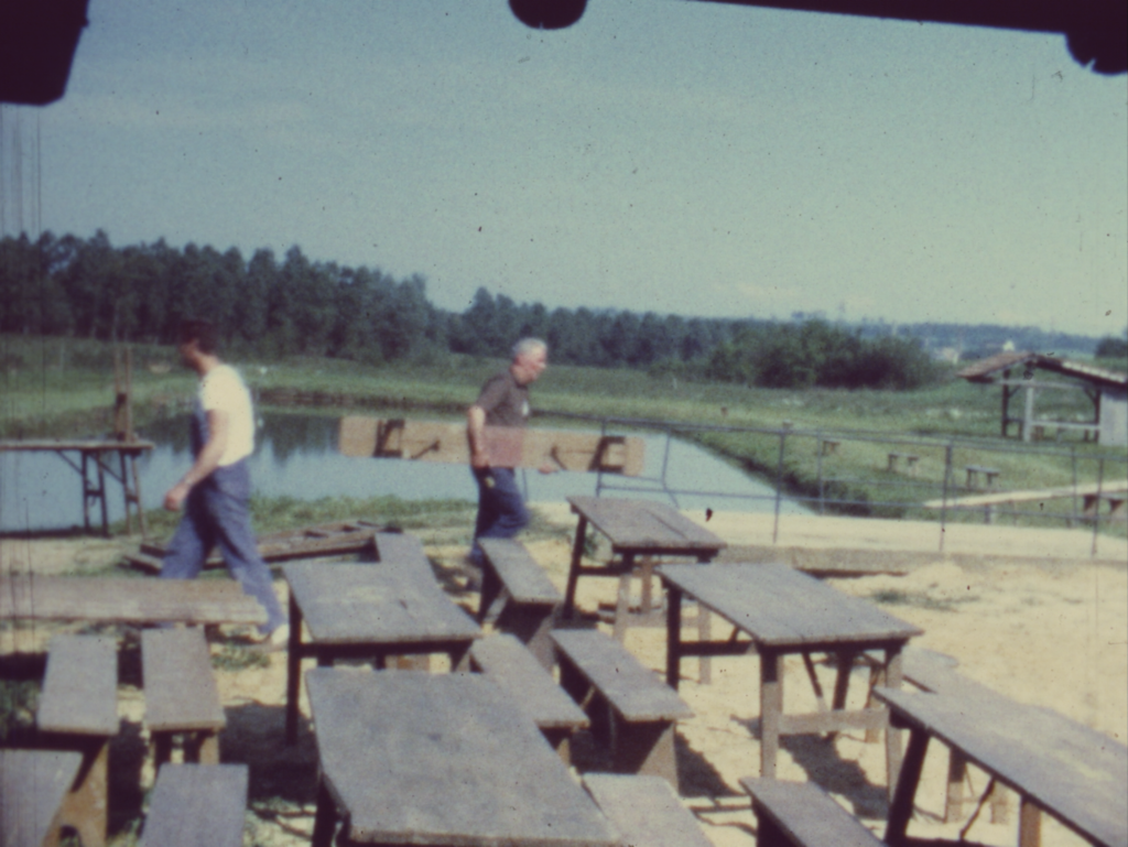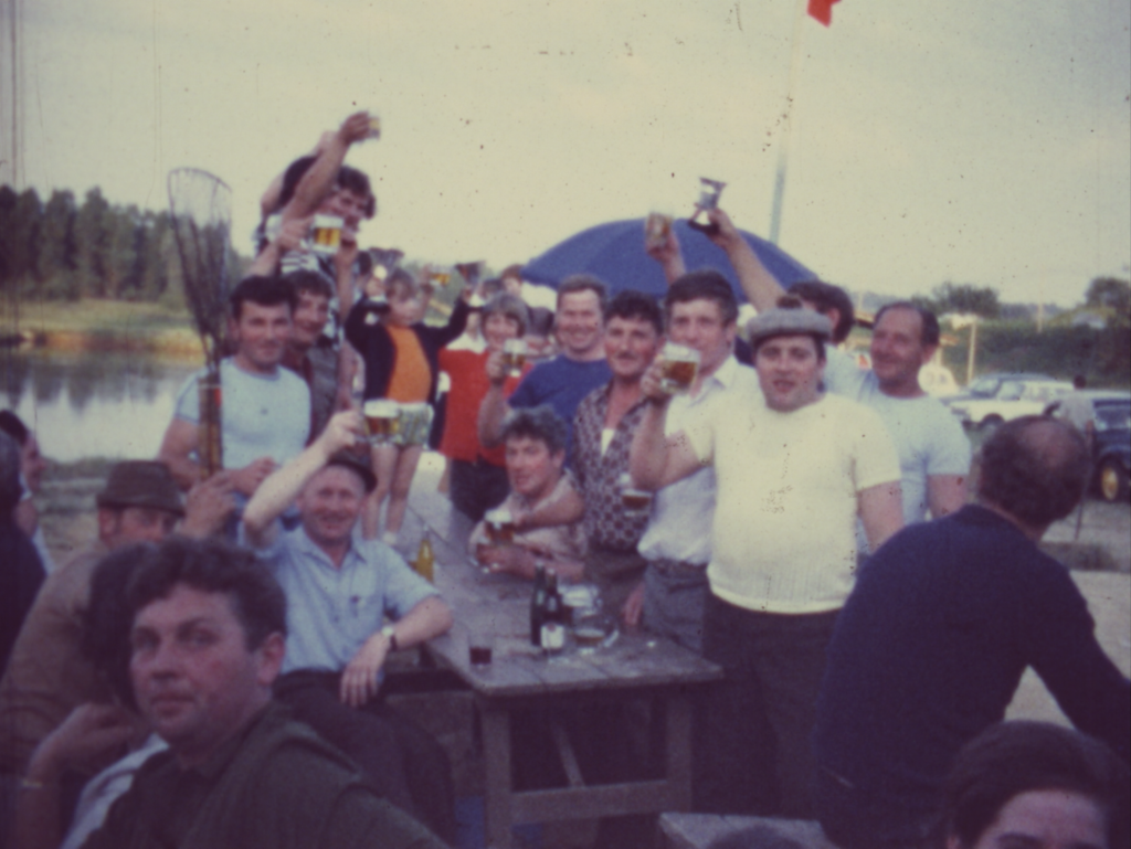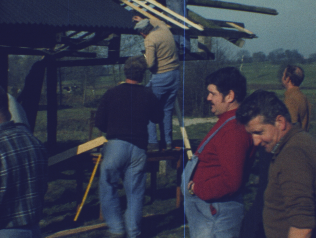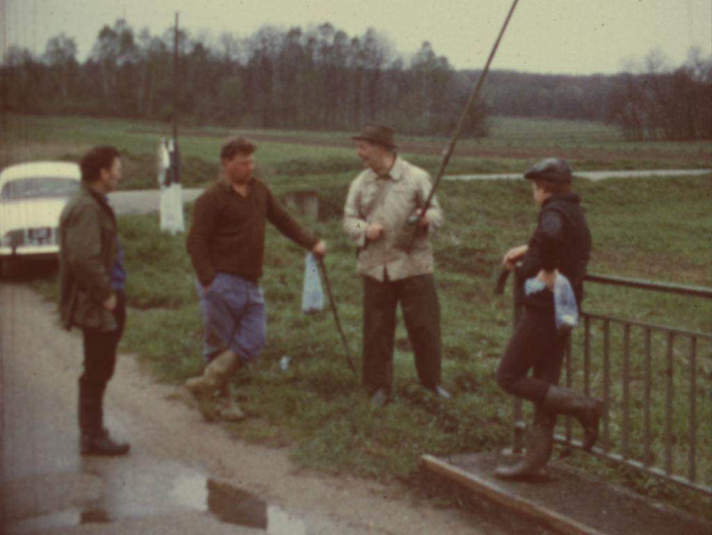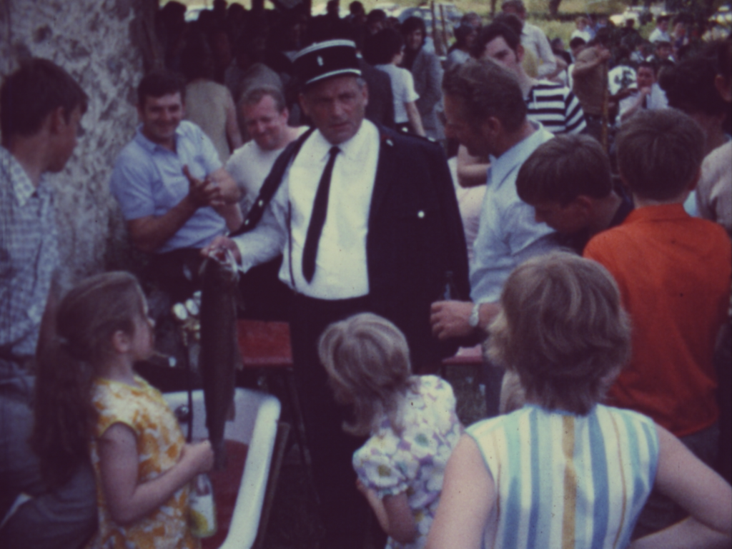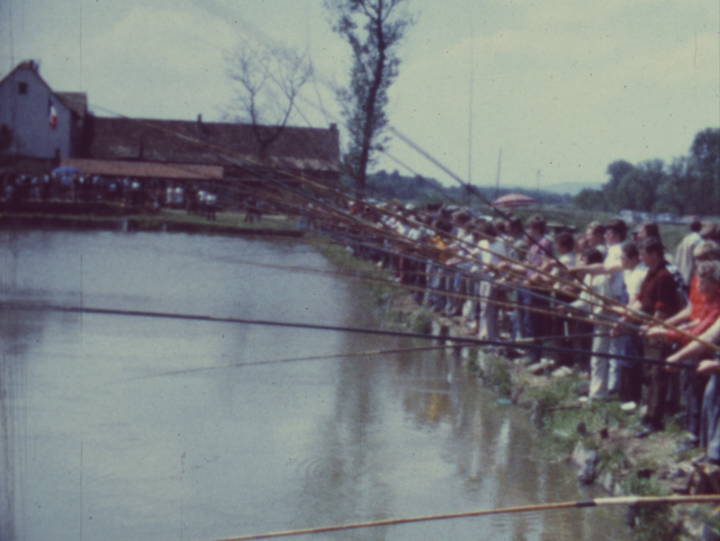 La prise de vue relève du « hobby » pour Gérard Fehr, passe-temps personnel qu’il combine avec une autre activité de loisir : la pêche. Gérard Fehr est en effet un membre très impliqué de l’association de pêche locale, dont il sera pendant de nombreuses années le président. Il enregistre les temps forts de l’association, comme lors d’un concours de pêche (voir le film Activités de l’Association de pêche et pisciculture de Kindwiller). À cette occasion, il retrace par exemple non seulement le déroulé du concours, ainsi que les moments de fêtes en famille ou entre amis à la guinguette, mais aussi l’ensemble des préparatifs du concours par les membres de l’association, qui se déroule dans la joie et la bonne humeur. On retrouve également cet esprit de camaraderie dans le film sonore Un repas de famille – Travaux à l’association de pêche et de pisciculture de Kindwiller, qui documente notamment des travaux de remplacement de la toiture d’un préau à proximité du bassin de pisciculture. Les membres de l’association se sont réunis pour prêter main forte, ou simplement pour suivre le déroulement des travaux, chacun y allant de son commentaire en alsacien. La bande-son permet tout particulièrement de rendre compte de l’ambiance animée et conviviale de ce moment où les membres de l’association, en grande partie des artisans, mettent leur savoir-faire professionnel au service de leur loisir. Au-delà de ces moments particuliers de la vie de l’association, on trouve plusieurs parties de pêche dans le premier film, signes d’une pratique quotidienne entre amis.