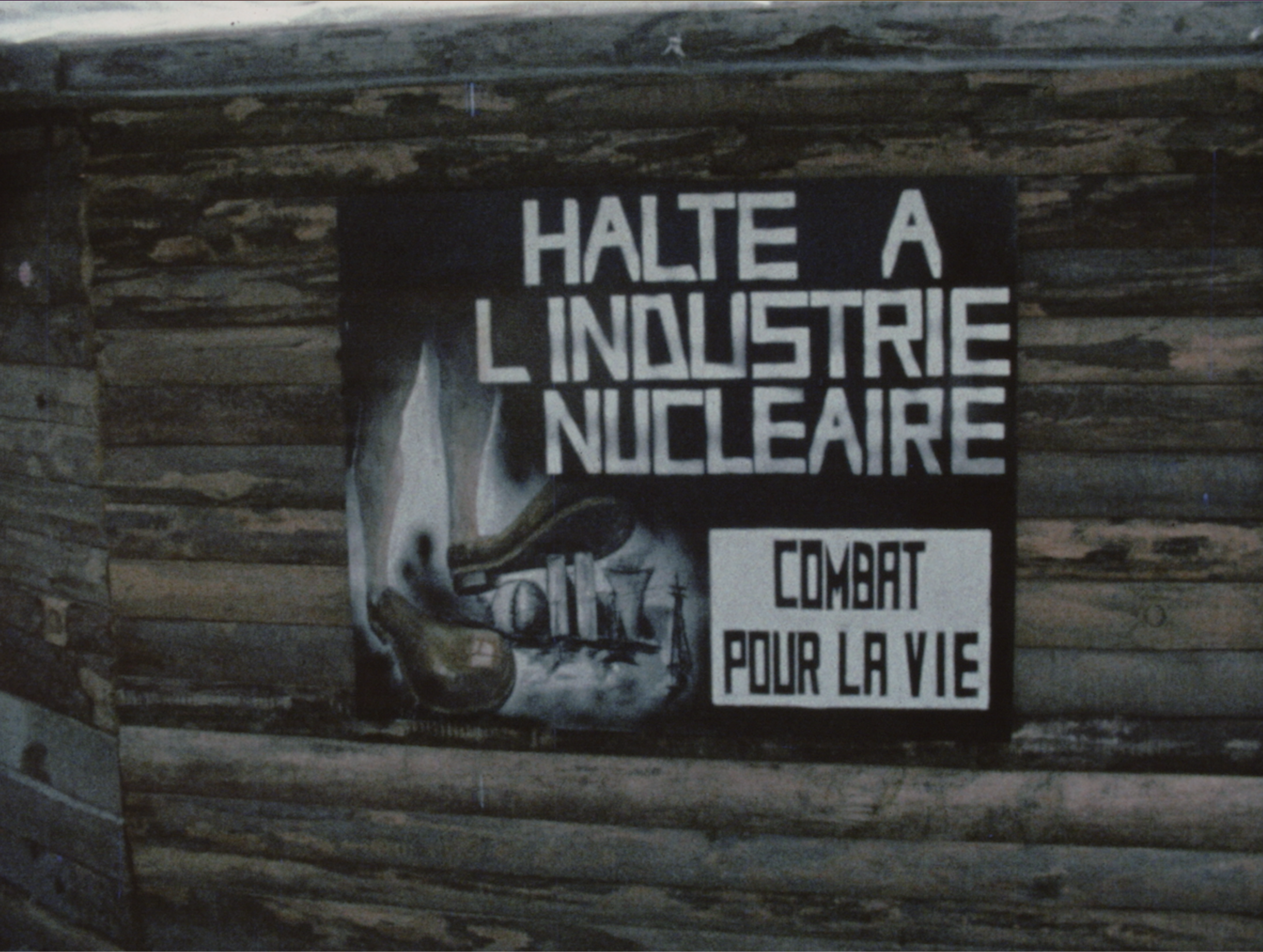 | Affiche anti-nucléaire (1975) et un pulvérisateur agricole (1975). Marcel Speisser, fonds Speisser © MIRA |